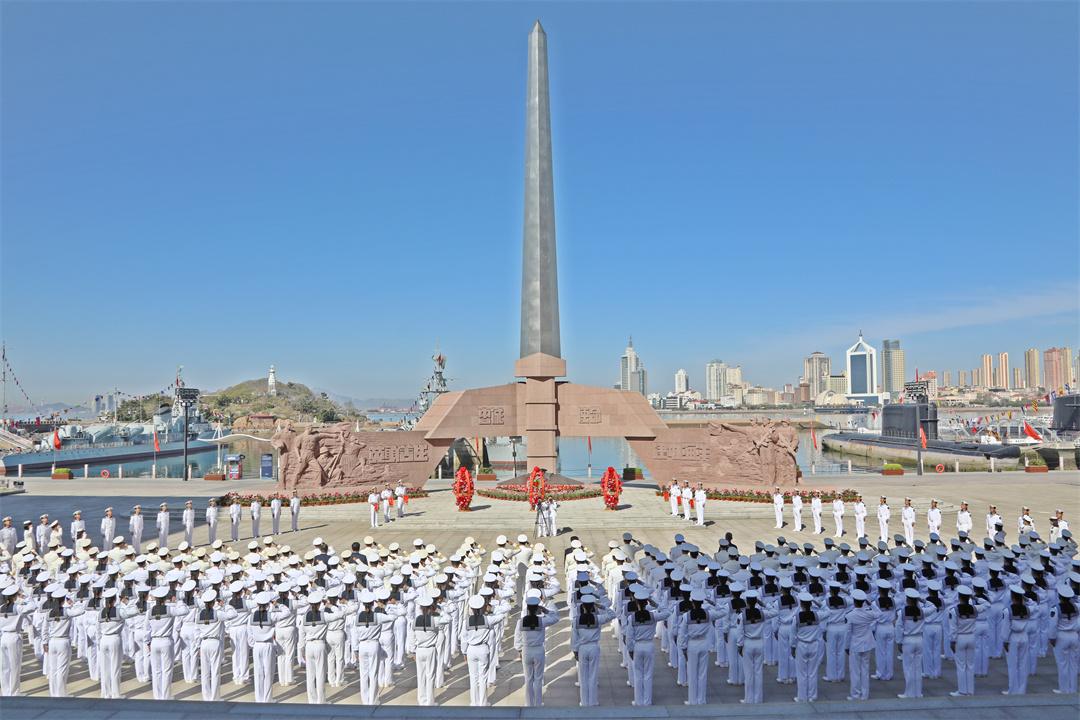 一声悠长的汽笛响过后,24名鸣笛礼兵同时吹响一长声两短声水兵笛,在场全体人员行举手礼,向人民海军英雄致敬。英雄广场“走向深蓝”主题雕塑巍峨矗立、剑指云天,剑体熔铸了被海军官兵击毁的敌舰机残骸,熊熊燃烧的长明火象征着海军英烈精神永存、代代相传。仪式最后,全场官兵齐唱《人民海军向前进》,留下了响彻海天的雄壮尾音。