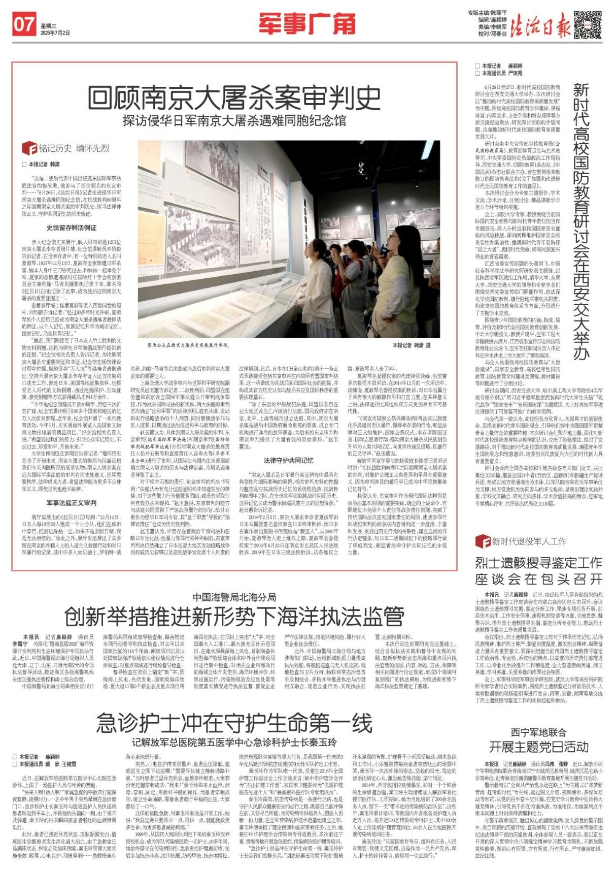 解放军南京军事法院杨俊庭长接受记者采访时说:“在抗战胜利80周年之际回顾南京大屠杀案的审判,对维护公理正义和世界和平具有重要意义,因为审判涉及的暴行早已成为中华民族集体记忆符号。”