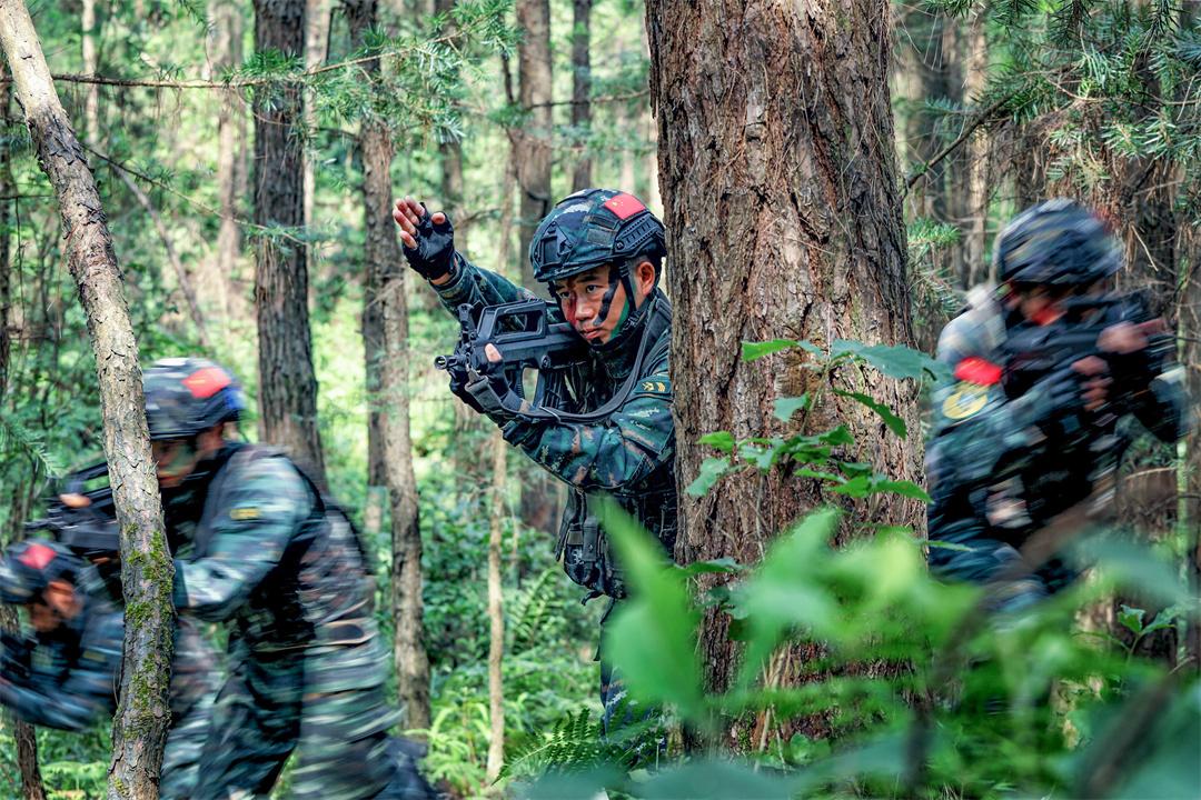 图为李兴坤(中)带领小队进行山林地捕歼战斗演练。