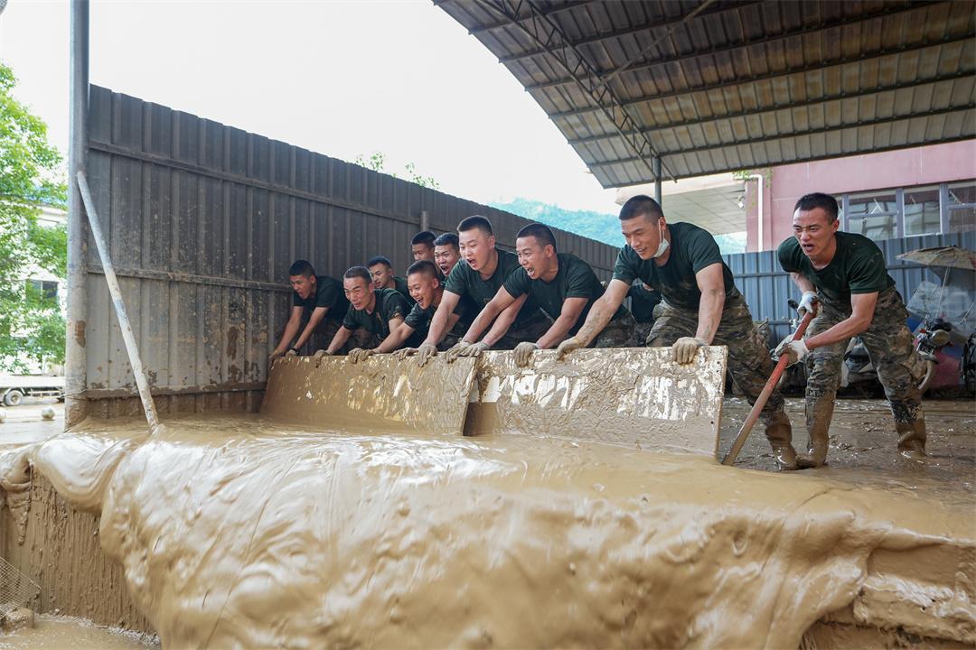 “虽然浑身是泥,一身臭味,但是想到完成任务后,老百姓就能恢复正常生活,就有使不完的劲。”战士马东昇说。他和战友穿梭在一条狭窄的巷道里,在巷道唯一的进出口,一段约25米长、倾角45度的斜坡上,官兵们在泥泞中俯身徒手清理淤泥垃圾,之后用小推车向外运送。