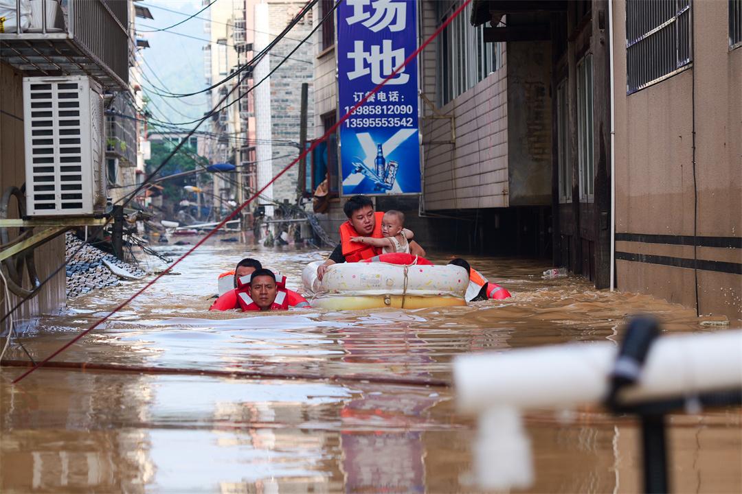 6月24日至7月5日,受持续强降雨及上游来水叠加影响,贵州省黔东南州榕江县城遭遇两次洪峰过境,境内多条河流水位持续上涨,县城多处低洼地带被淹,人民群众生命财产安全遭受严重威胁。武警贵州总队闻令而动,先后派出千余名官兵携带救生衣、冲锋舟、挖掘机、推土机等救援器材奔赴一线,紧急驰援。