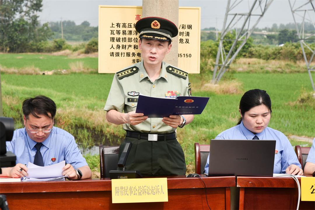 7月15日,解放军南京军事检察院协同淮安市盱眙县人民检察院,对一起过失损坏军事通信案提起刑事附带民事公益诉讼,并在案发地盱眙县马坝镇一处农田间公开开庭审理。盱眙县人民检察院检察长潘凌云作为公诉人出庭指控犯罪,南京军事检察院大校检察长刘剑作为附带民事公益诉讼起诉人出庭提起民事公益诉讼,盱眙县人民法院院长田庚担任审判长。为加大案件警示教育效果,庭审邀请全国人大代表、江苏省人大代表、部队有关人员,以及案发地附近村民100余人参与旁听。