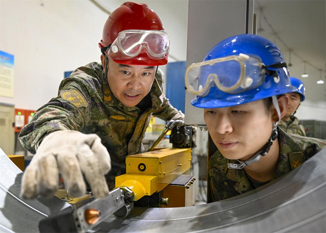 图为崔道虎 (左一)帮带战友查找排除设备故障。刘明松 摄
