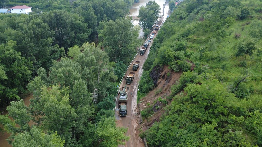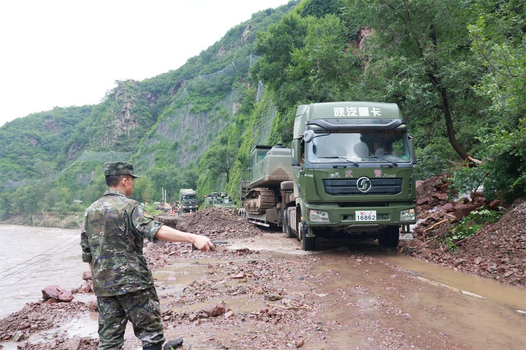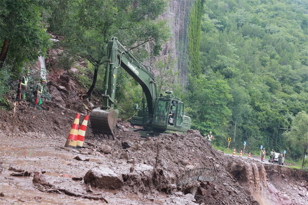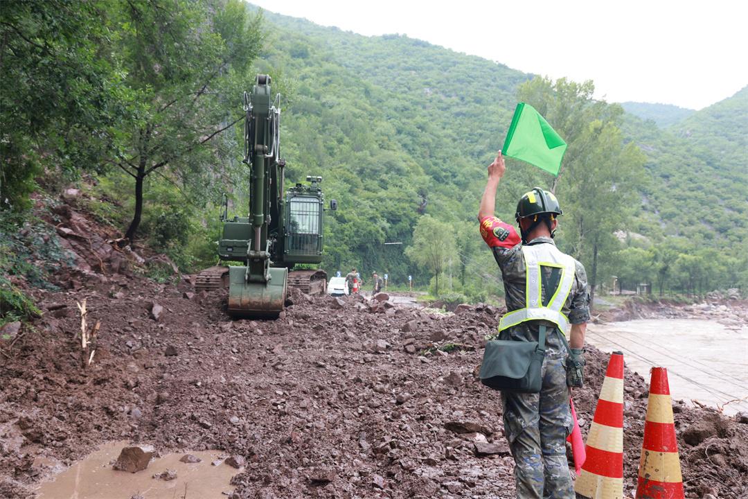 7月27日,北京市延庆区兴阳线、四宝路等多处发生险情,武警第一机动总队某支队迅速出动挖掘机,装载机,照明车等20余台(套)大型机械装备,第一时间抵达现场展开抢险救援作业。