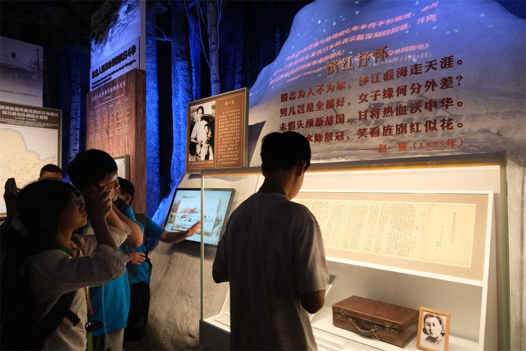图为参观群众认真观看展出的赵一曼相关文物。