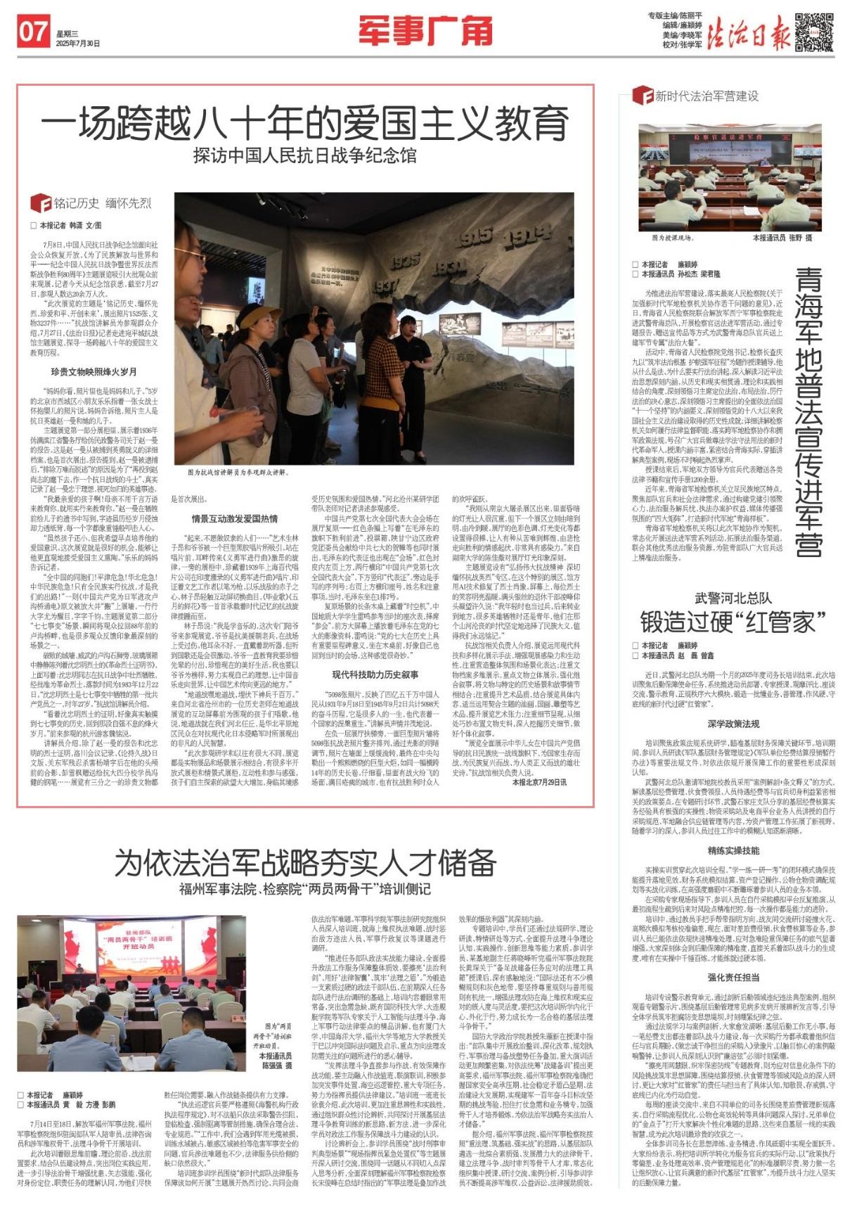 “此次展览的主题是‘铭记历史、缅怀先烈、珍爱和平、开创未来’,展出照片1525张、文物3237件……”抗战馆讲解员为参观群众介绍。7月27日,《法治日报》记者走进宛平城抗战馆主题展览,探寻一场跨越八十年的爱国主义教育历程。
