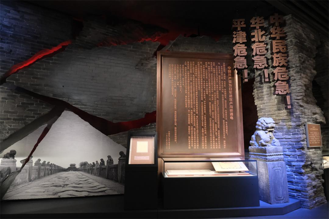 “全中国的同胞们!平津危急!华北危急!中华民族危急!只有全民族实行抗战,才是我们的出路!”一则《中国共产党为日军进攻卢沟桥通电》原文被放大并“搬”上展墙,一行行大字尤为醒目,字字千钧。主题展览第二部分“七七事变”场景,瞬间将观众拉回88年前的卢沟桥畔,也是很多观众反馈印象最深刻的场景之一。