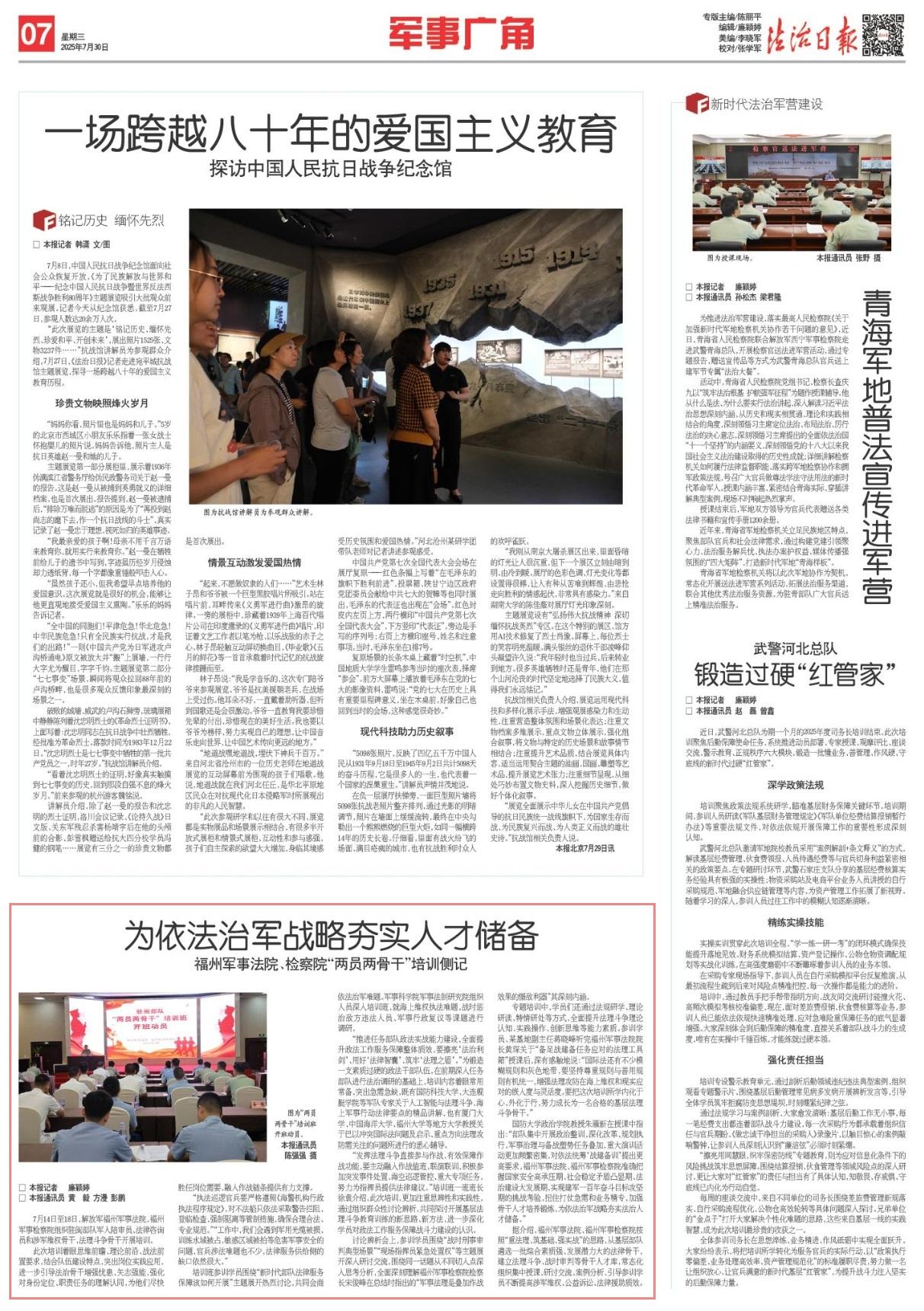 据介绍,福州军事法院、福州军事检察院按照“重法理、筑基础、强实战”的思路,从基层部队遴选一批综合素质强、发展潜力大的法律骨干,建立法理斗争、战时审判等骨干人才库,常态化组织集中授课、研讨交流、案例分析,引导参训学员不断提高涉军维权、公益诉讼、法律援助质效。