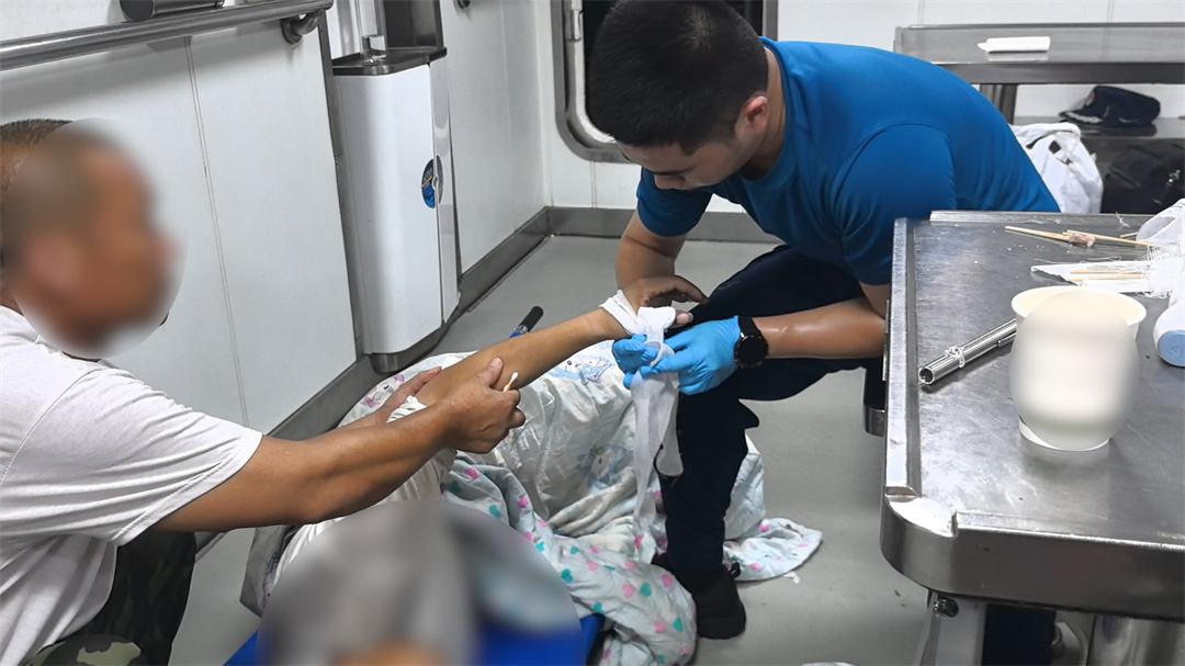 8日凌晨2时许,永隆舰抵达救助渔船,先将受伤渔民抬至担架并进行基本固定,随后成功将受伤渔民转移至舰上,对其受伤部位进行消毒和包扎。返航期间,医师密切观察伤者生命体征,同时不断安抚伤者情绪。经过一夜的紧急航行,永隆舰于8日6时许顺利靠泊南通海警码头,成功将受伤渔民转移至岸上接应的救护车并送往南通市海门区人民医院救治。目前,受伤渔民生命体征平稳,正在接受进一步治疗。