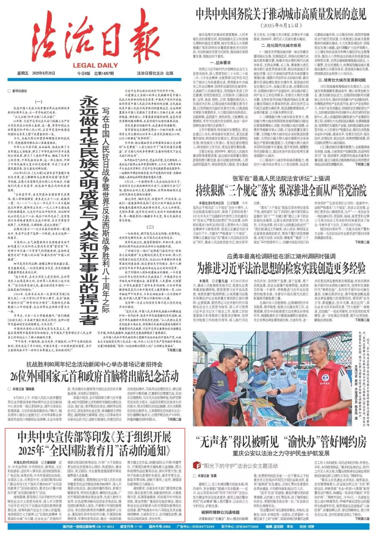 近日,中央宣传部、中央网信办、教育部、文化和旅游部、退役军人事务部、国务院国资委、广电总局、体育总局、中央军委国防动员部、全国总工会、共青团中央、全国妇联等12部门联合印发《关于组织开展2025年“全民国防教育月”活动的通知》,要求在9月集中组织开展“全民国防教育月”活动。