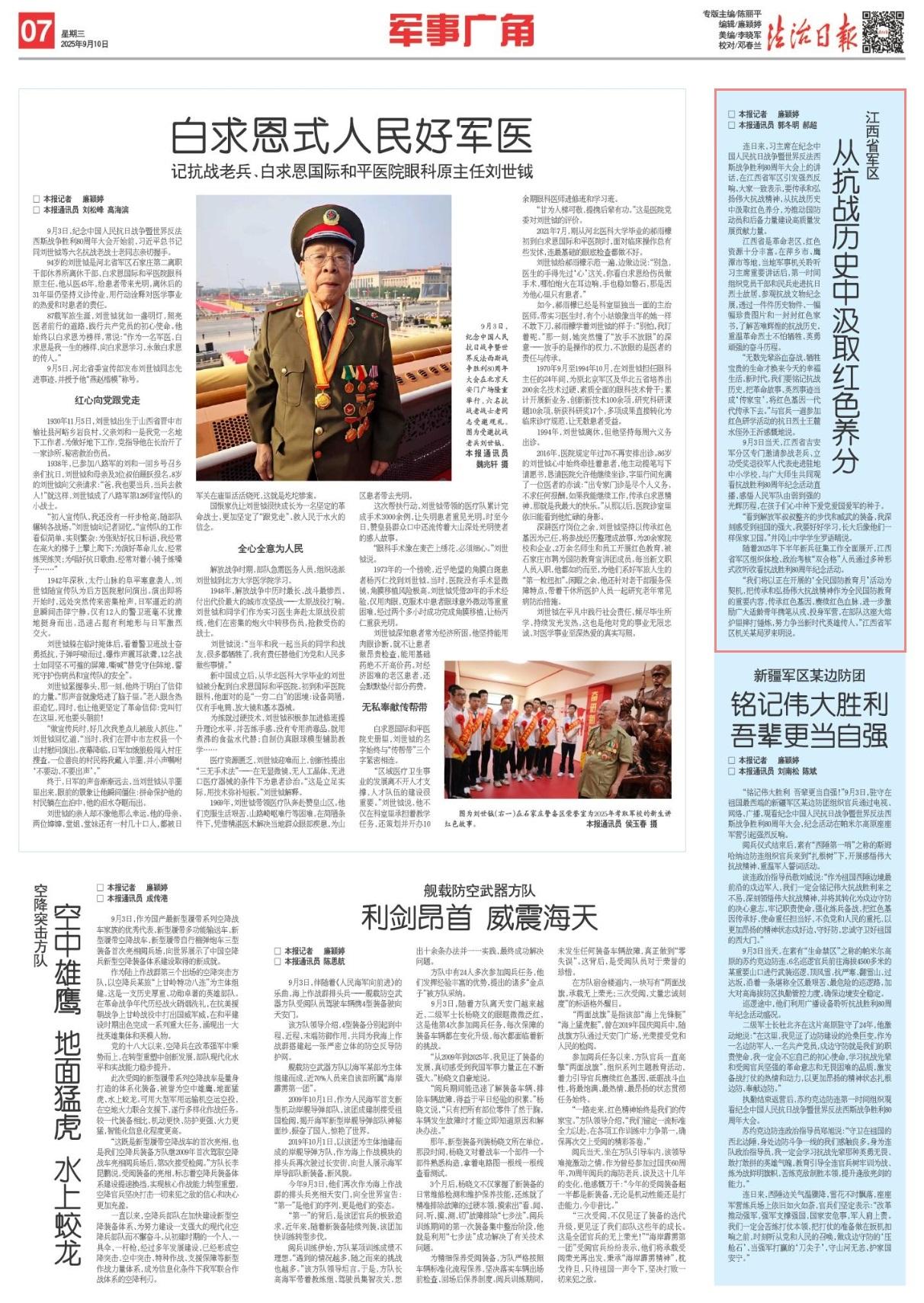9月3日当天,江西省吉安军分区专门邀请参战老兵、立功受奖退役军人代表走进驻地中小学校,与广大师生共同观看抗战胜利80周年纪念活动直播,感悟人民军队由弱到强的光辉历程,在孩子们心中种下爱党爱国爱军的种子。