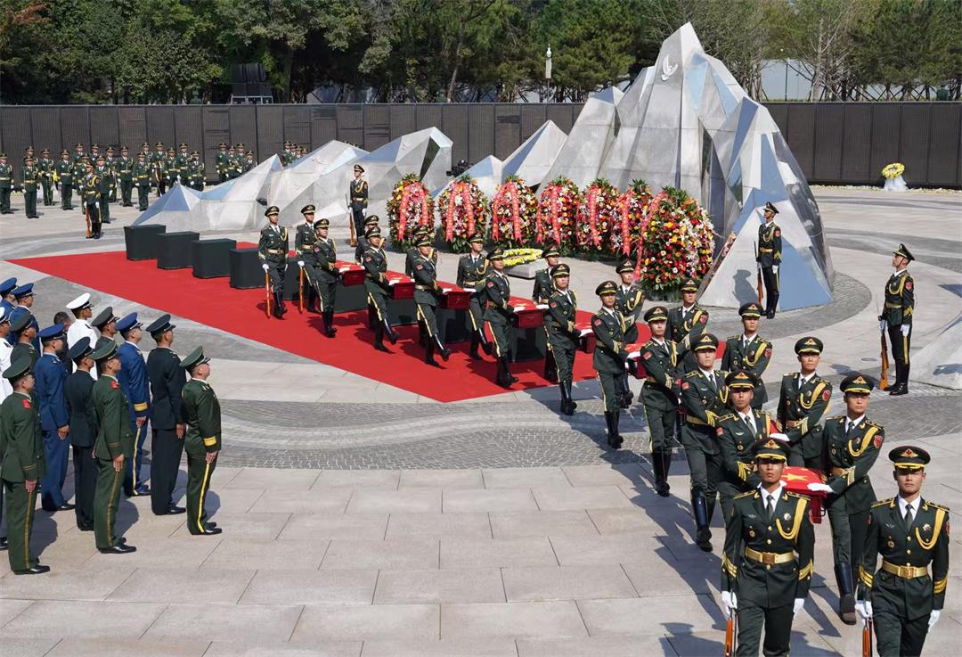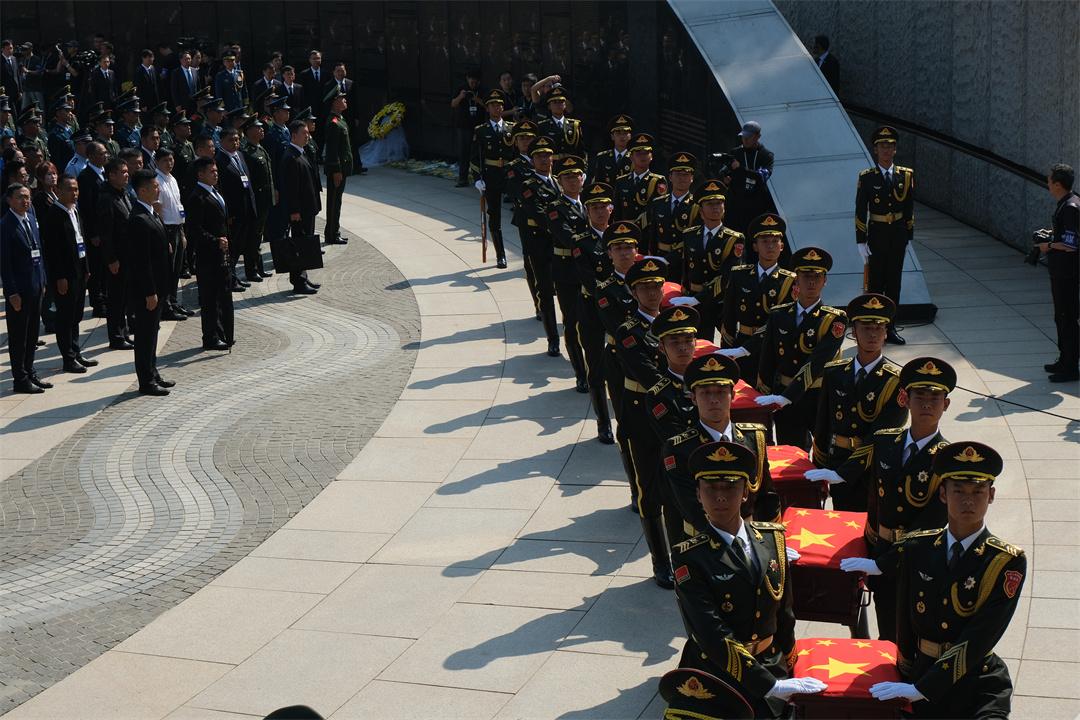 “中国人民志愿军烈士永垂不朽!”退役军人事务部党组书记、部长裴金佳出席仪式并致祭文。全体人员向志愿军烈士遗骸三鞠躬,27名礼兵连续鸣枪12响,向志愿军烈士致以崇高敬意。