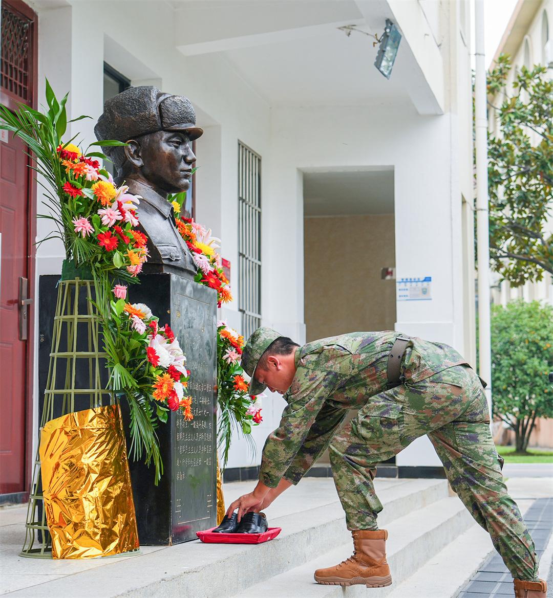 在纪念活动现场,齐步、俯身放鞋、敬礼……今年参加阅兵任务的排长魏一涵,小心翼翼托着那双通过天安门的皮鞋,俯身放在老排长铜像前。这一刻,老排长终于圆梦。