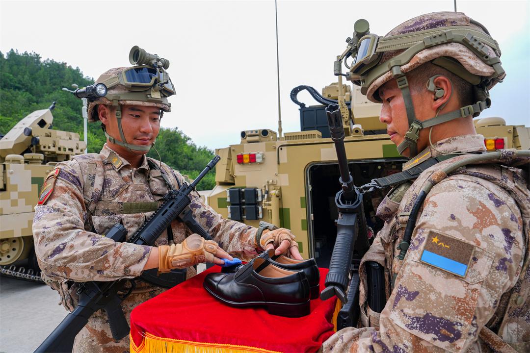 图为连队受阅官兵正在悉心擦拭孙占元老排长的新皮鞋,9月3日当天一同走过天安门,接受党和人民的检阅。王晨曦 摄