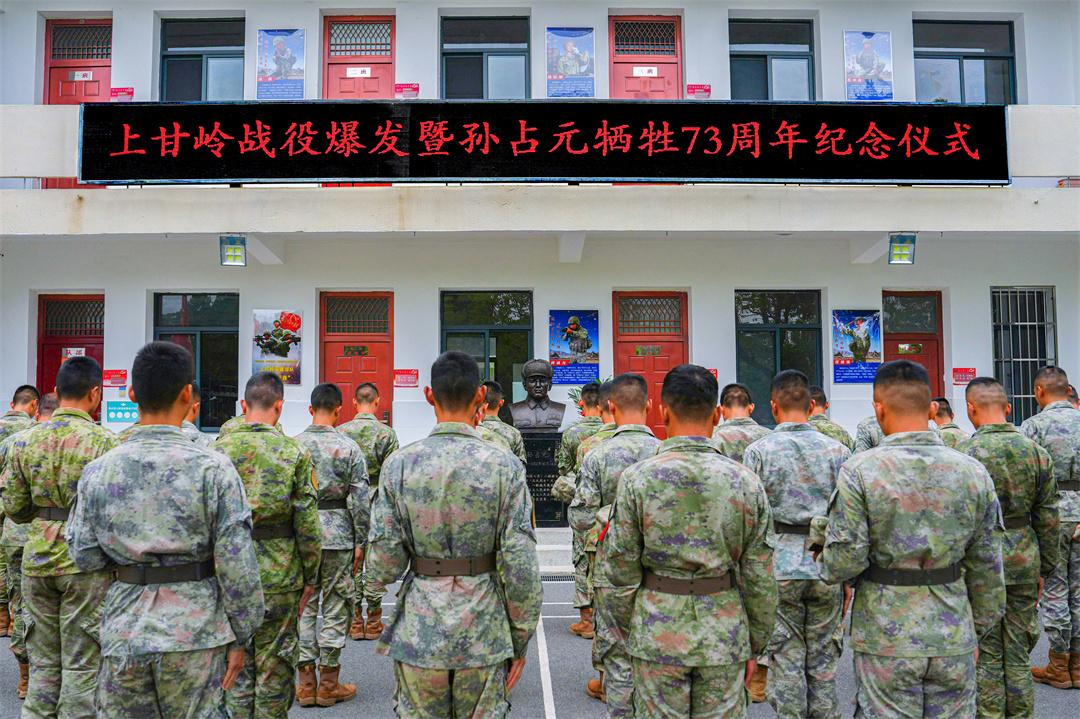 纪念仪式开始,连队官兵仔细整理花篮绸带,并脱帽默哀,深切缅怀孙占元老排长。花篮上“纪念上甘岭战役爆发73周年”“纪念一级英雄孙占元牺牲73周年”的绸带随风飘扬。
