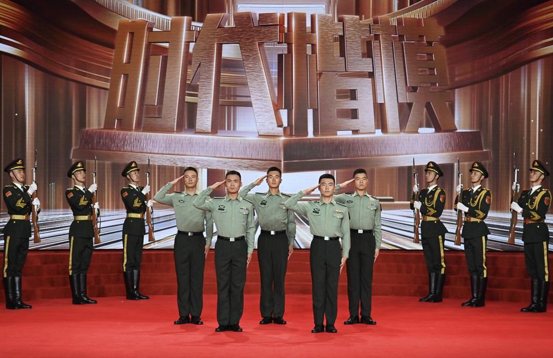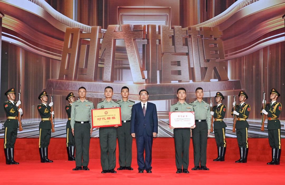 图为在“时代楷模”发布仪式上,陆军第八十二集团军某旅“刘老庄连”官兵代表领取“时代楷模”奖牌和证书。张永进 摄