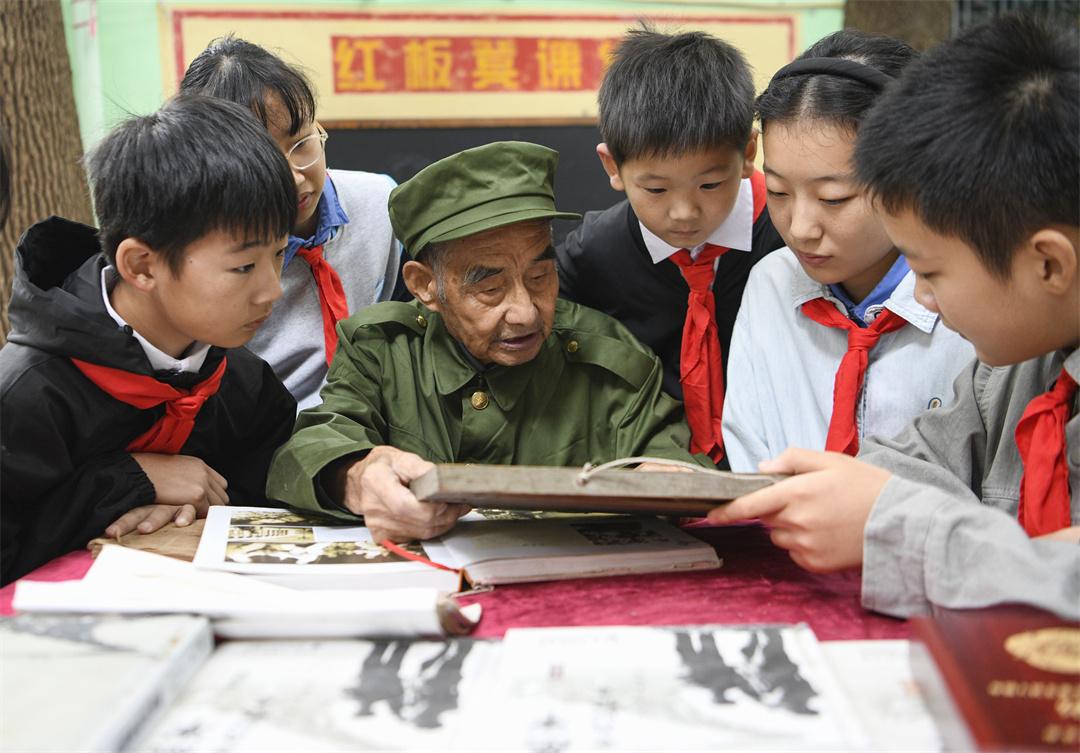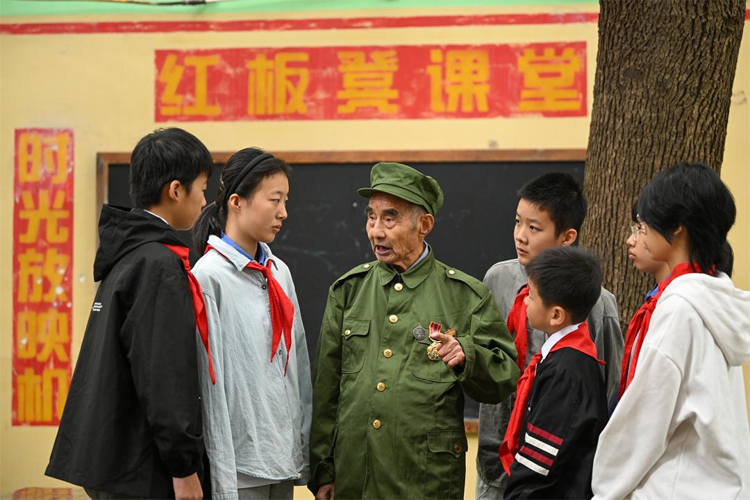 在10月25日中国人民志愿军抗美援朝出国作战75周年纪念日到来之际,安徽省合肥市蜀山区南七街道洪岗社区“红板凳课堂”,邀请95岁抗美援朝老兵张秉轴给孩子们讲述战斗故事,引导他们缅怀革命先烈,争当新时代好少年。