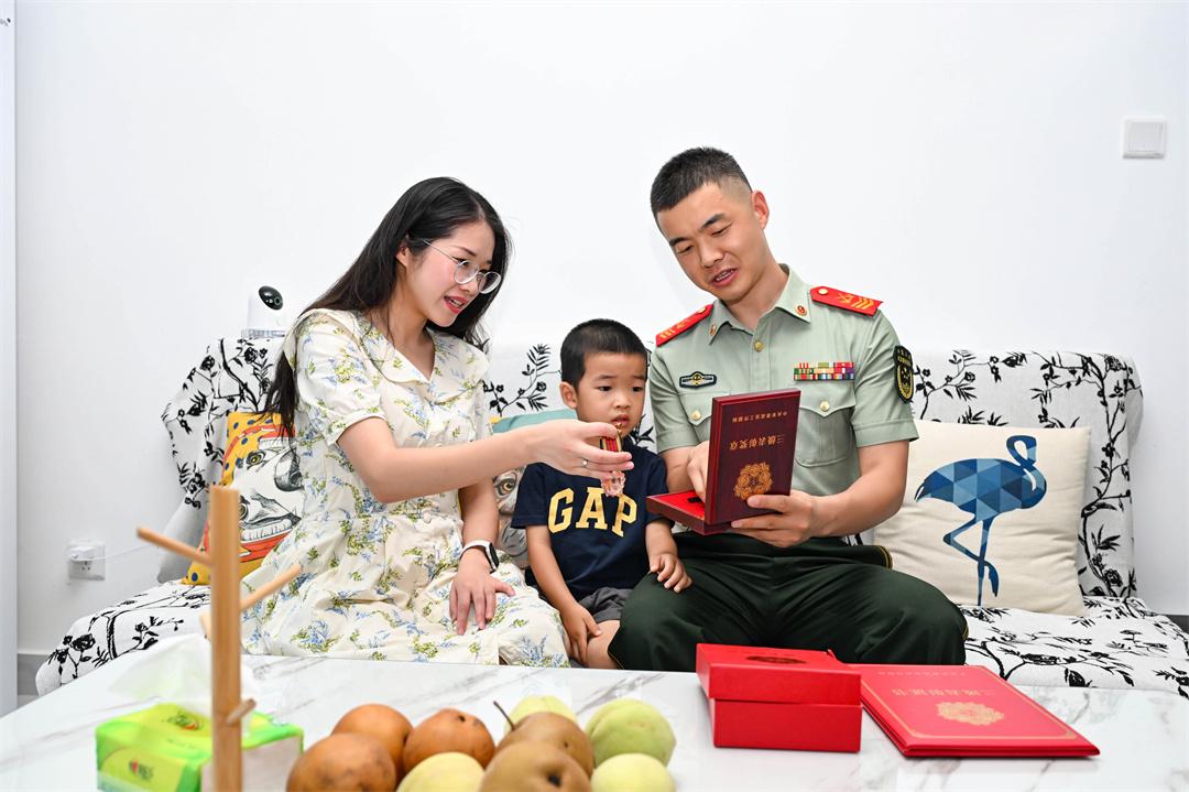 图为赵阳给孩子讲述自己勋章背后的故事。