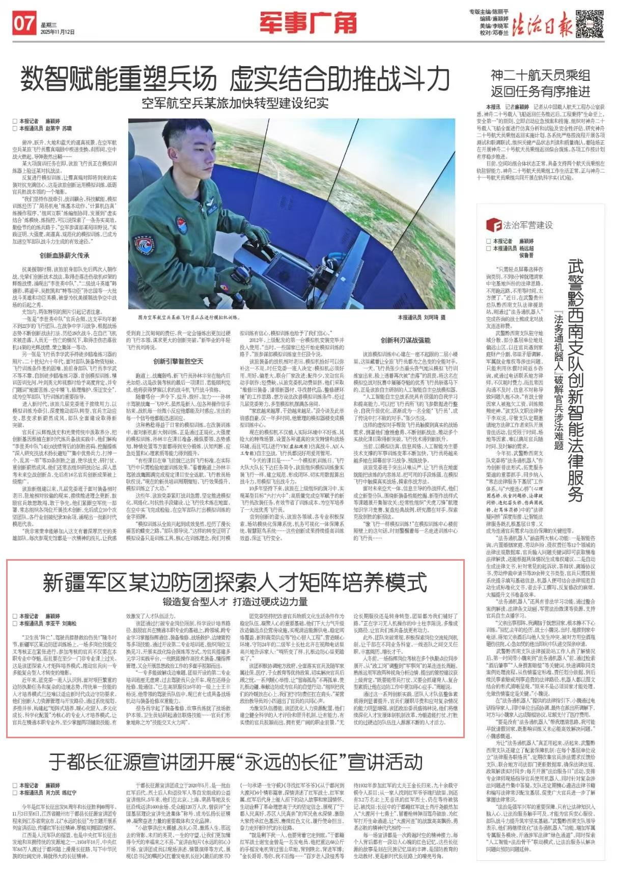 为激发队伍潜能,该团优化人力资源配置。他们建立健全科学的人才评价和晋升机制,让有能力、有实绩的官兵脱颖而出,拥有更广阔的职业前景。“无论长期服役还是转身转型,团里都为我们铺好了路。”正在学习无人机操作的中士杜李陈说,多维成长路径,让官兵们练兵备战更有动力。
