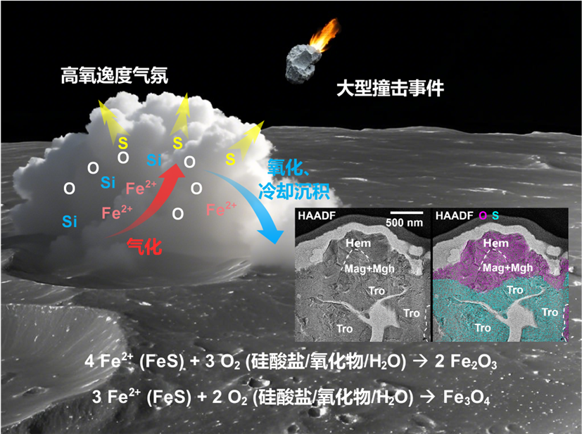 图为嫦娥六号样品中发现的铁氧化物成因示意图。图中表示了月球表面物质在大尺度撞击下气化,产生局部的高氧逸度气氛。高温环境使得陨硫铁(FeS)矿物脱硫,并在适当的温度条件(700~1000℃)下被高氧逸度的气氛氧化,形成了赤铁矿(α-Fe2O3)、磁赤铁矿(γ-Fe2O3)和磁铁矿(Fe3O4)。