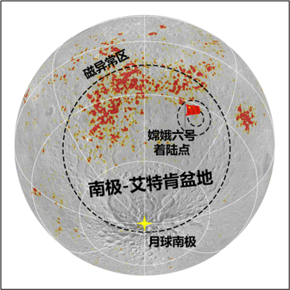 图为嫦娥六号任务着陆点位于月球南极-艾特肯(South Pole-Aitken,SPA)盆地东北方向的阿波罗盆地中,与SPA盆地西北部的磁异常区相邻。本研究基于嫦娥六号样品中铁氧化物的发现提出了一种新的月球磁异常的撞击成因假说。