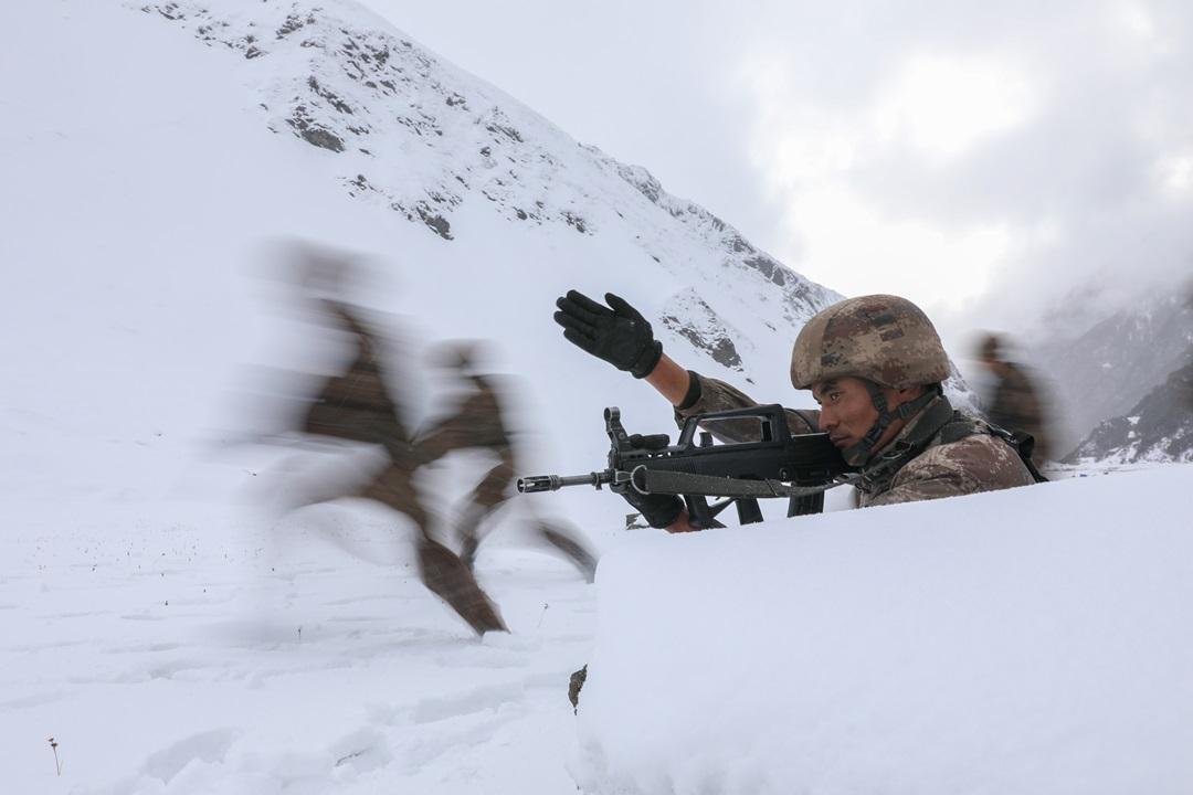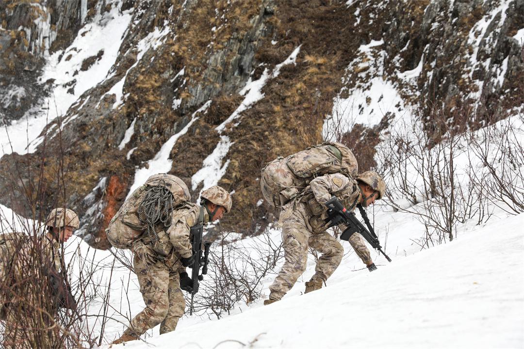 图为寒风凛冽中,次罗布(右一)与战友屈身前行攀爬险坡。