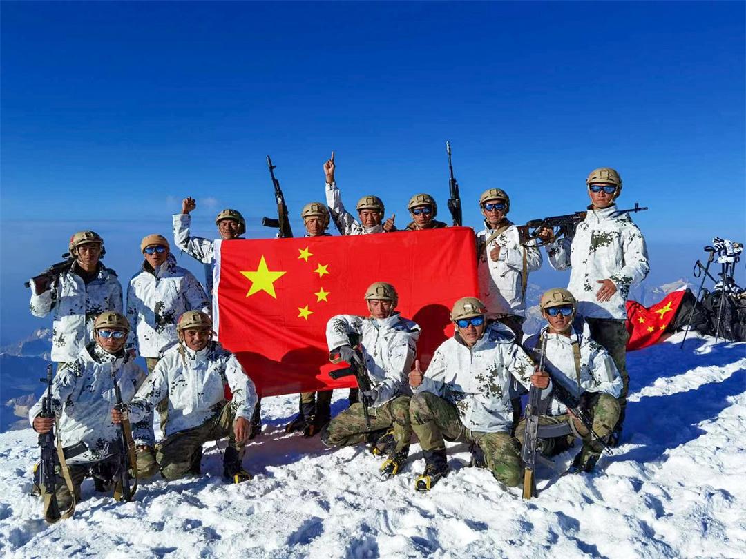 图为2022年“厄尔布鲁士之环”国际军事比赛中,次罗布(前排左二)与战友们登顶厄尔布鲁士西峰山顶。