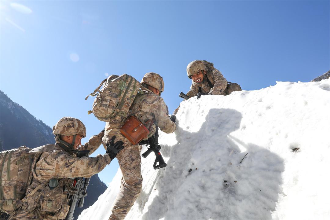 图为次罗布(右一)与战友通力协作,帮助新兵卿金科(右二)登顶雪峰。