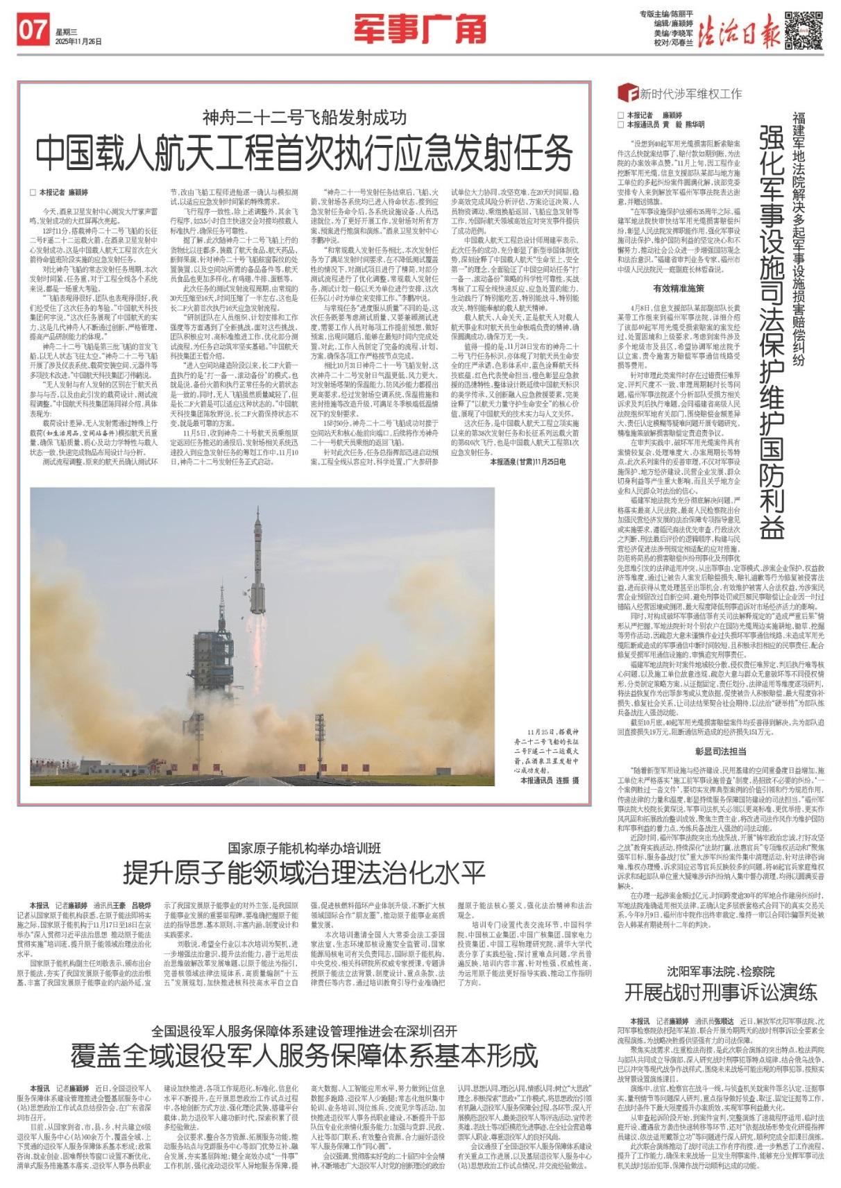 12时11分,搭载神舟二十二号飞船的长征二号F遥二十二运载火箭,在酒泉卫星发射中心发射成功。这是中国载人航天工程首次在火箭待命值班阶段实施的应急发射任务。