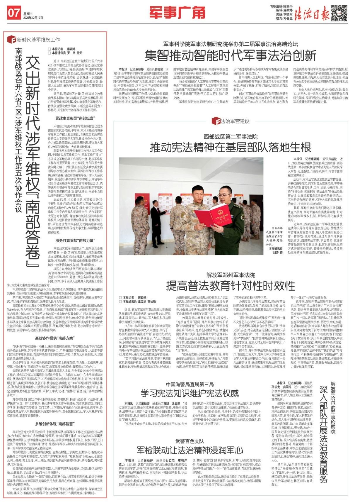 经过多年发展,军地相关职能部门在需求上精准对接、在力量上加强统筹、在资源上强化整合,南部战区六省(区)涉军维权协作顺畅,凝聚强大工作合力。