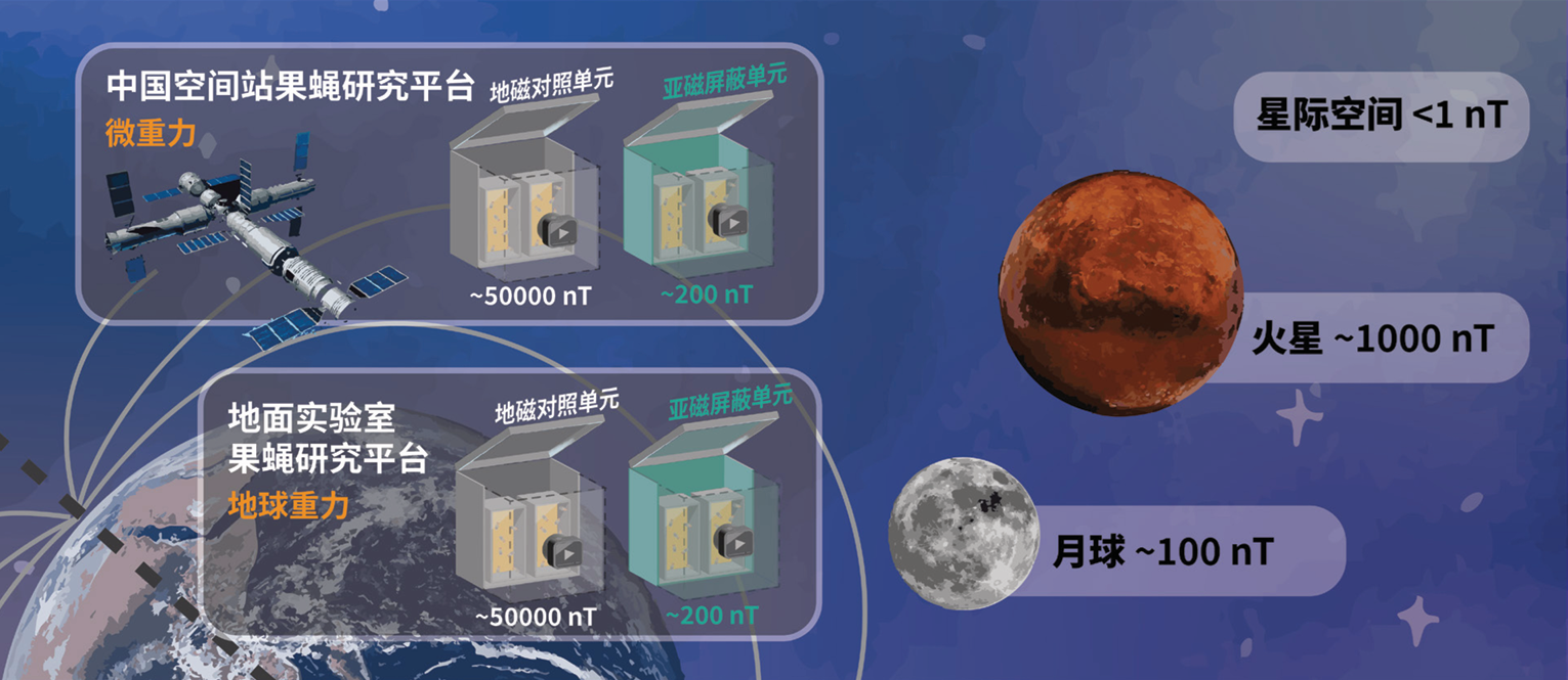 图为空间亚磁-微重力复合环境果蝇培养及生物学效应研究体系。
