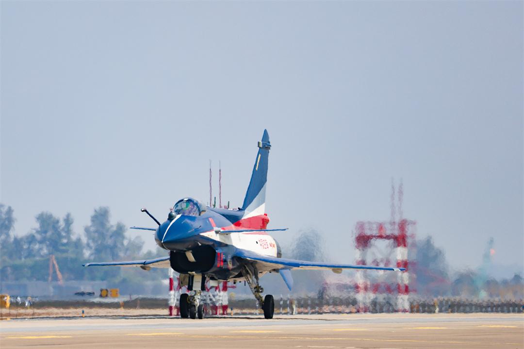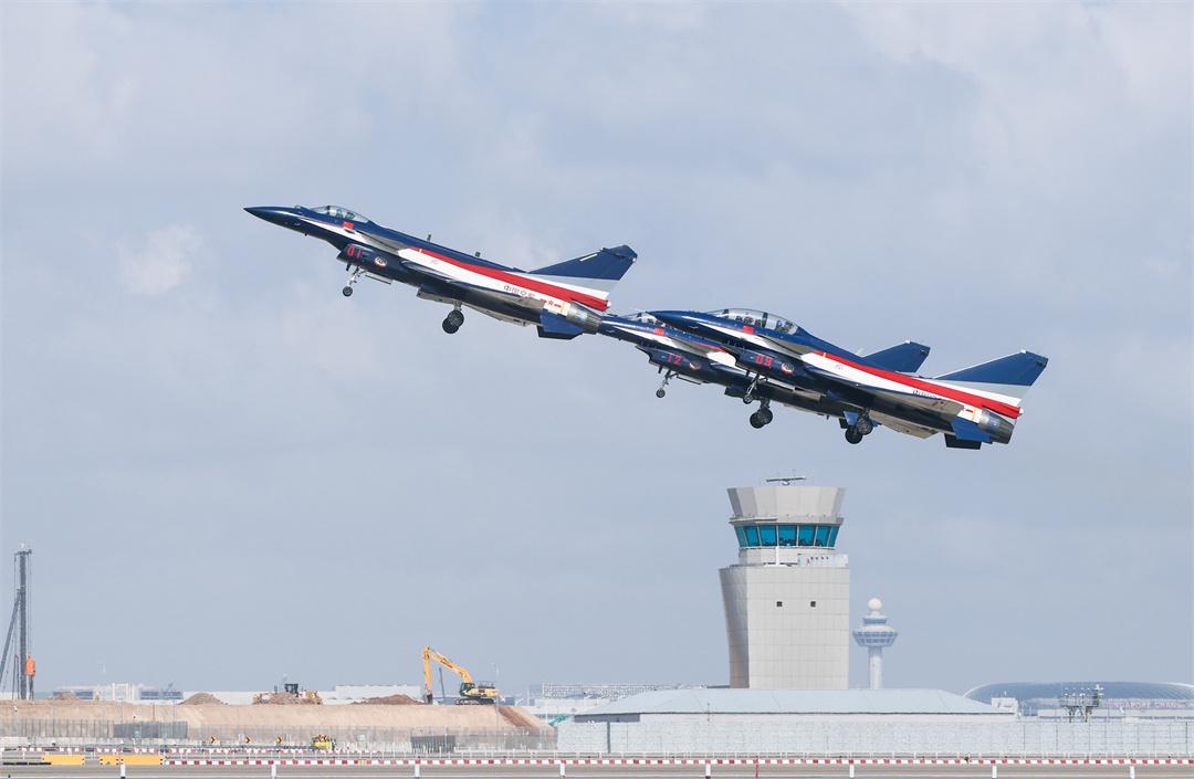 10时许,空军八一飞行表演队6架喷涂五星红旗和八一军旗的歼-10表演机缓缓滑行至起飞线,编排成2个三机编队,等待起飞指令下达。
