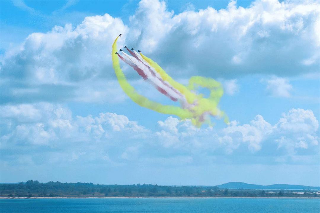 抵达表演空域后,6架歼-10表演机率先进行六机超密集编队通场,拉出象征中新两国国旗颜色的红、黄、白三色彩烟,低空掠过海面。六道彩色航迹犹如彩虹一般,勾勒出优美多姿的轨迹。随后,五机、四机、双机、单机等特技动作有序衔接,编队整齐划一、动作流畅紧密。