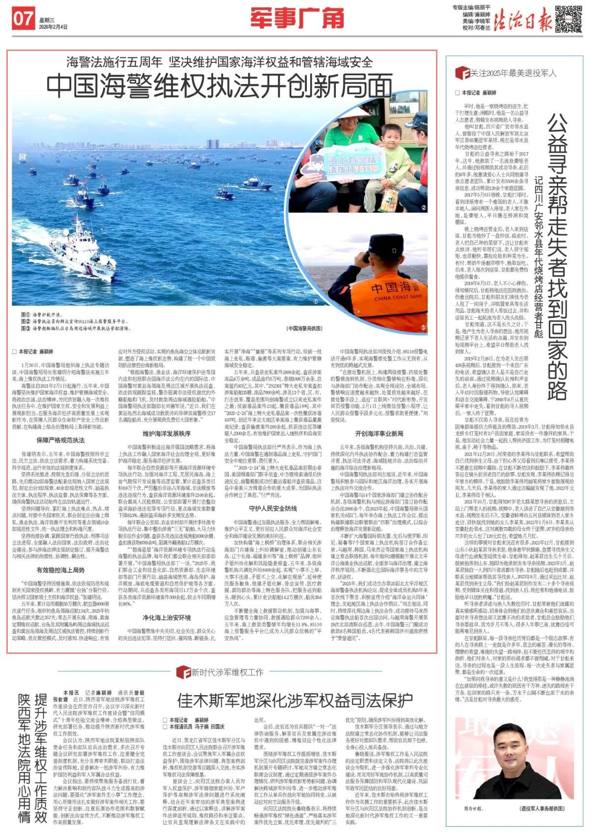海警法自2021年2月1日起施行,五年来,中国海警坚决维护国家海洋权益、维护管辖海域安全,将政治忠诚、法治精神、为民宗旨融入每一次维权执法任务中,在维护国家主权、安全和发展利益上展现新担当,在服务海洋经济高质量发展上实现新作为,在保障人民群众生命财产安全上作出新贡献,在构建海上综合治理格局上取得新突破。