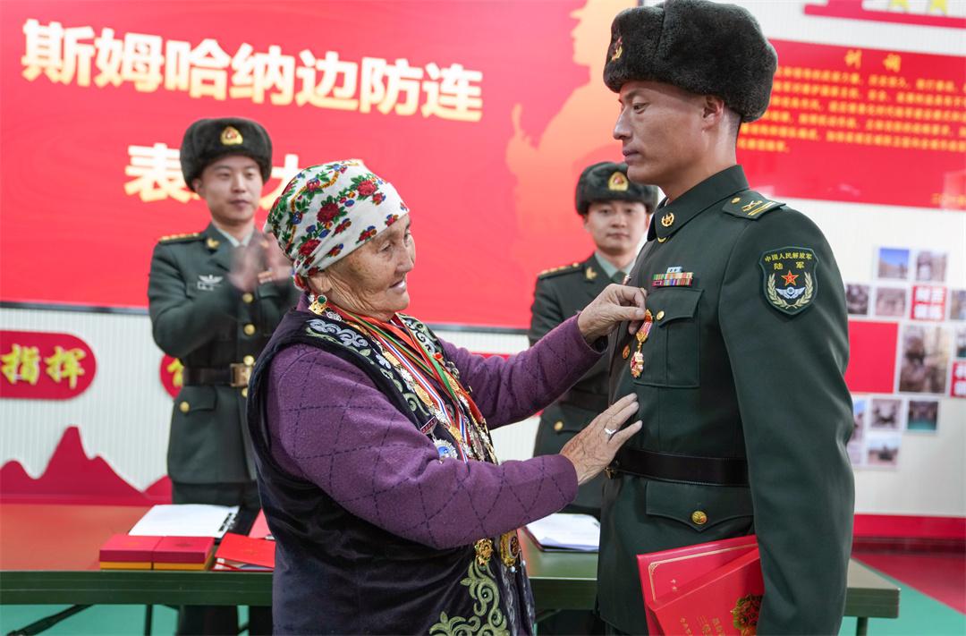 “请‘人民楷模’布茹玛汗老大妈为三等功获得者张鹏飞颁奖。”连长井杨杨话音落下,老人稳步上前,双手郑重地将奖章佩戴在二级上士张鹏飞胸前。合影时,她凝望着战士的笑脸,眼中满是欣慰与骄傲。