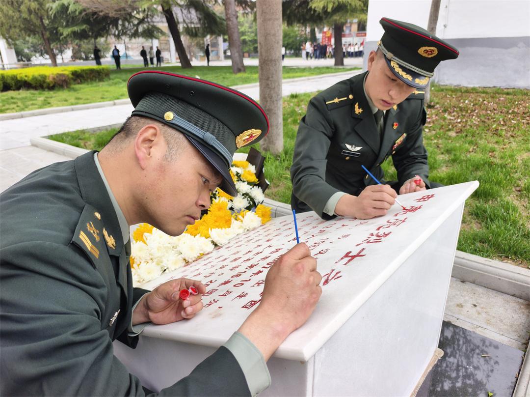 图为申亮亮的战友来到温县烈士陵园为英雄卧碑描红。