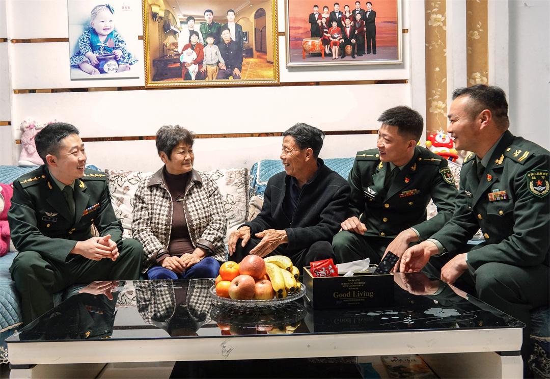 图为部队官兵来到申亮亮家中看望英雄父母,与老人亲切交谈。