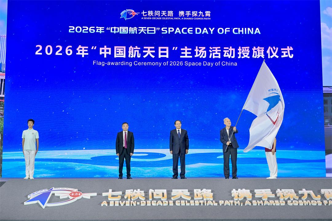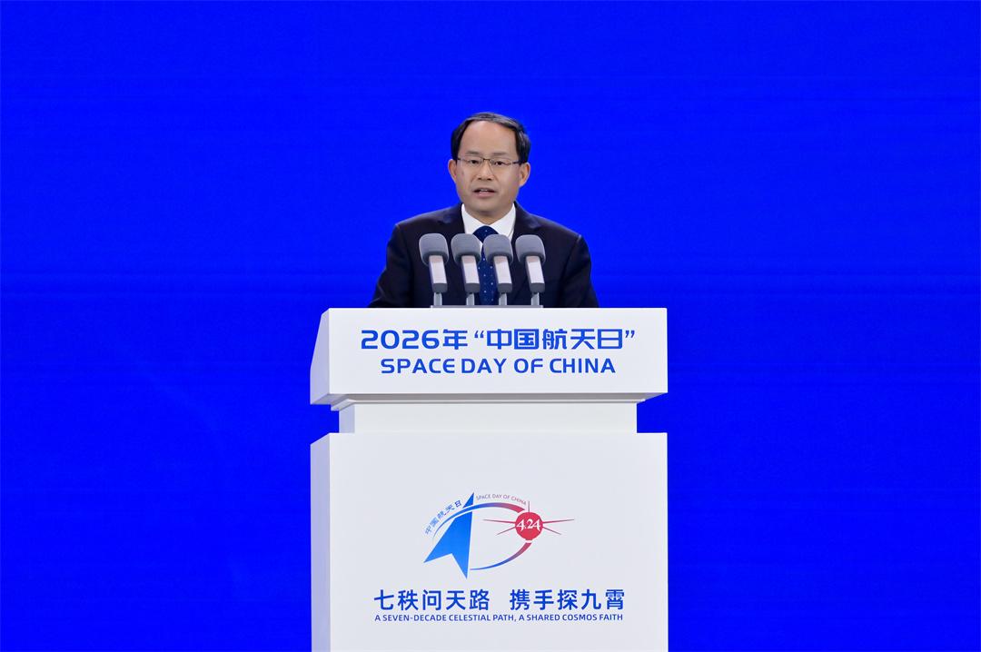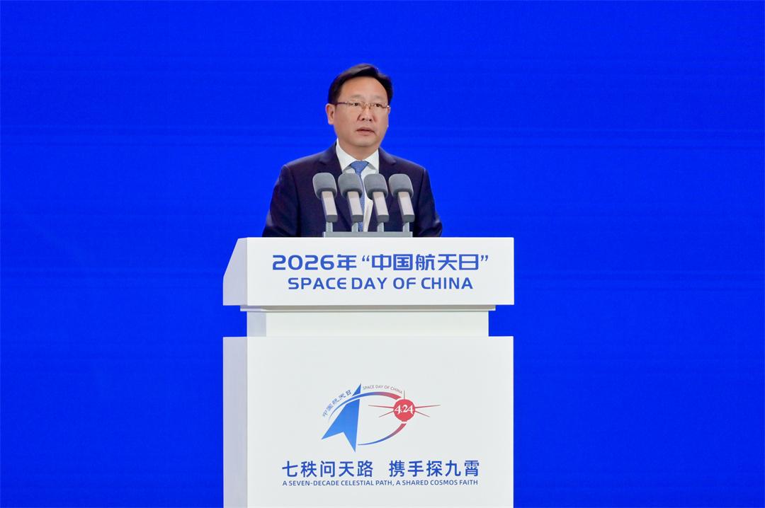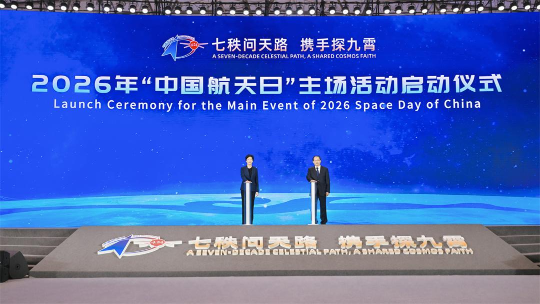 图为四川省委副书记、省长施小琳与工业和信息化部副部长、国家航天局局长单忠德共同启动2026年“中国航天日”主场活动。