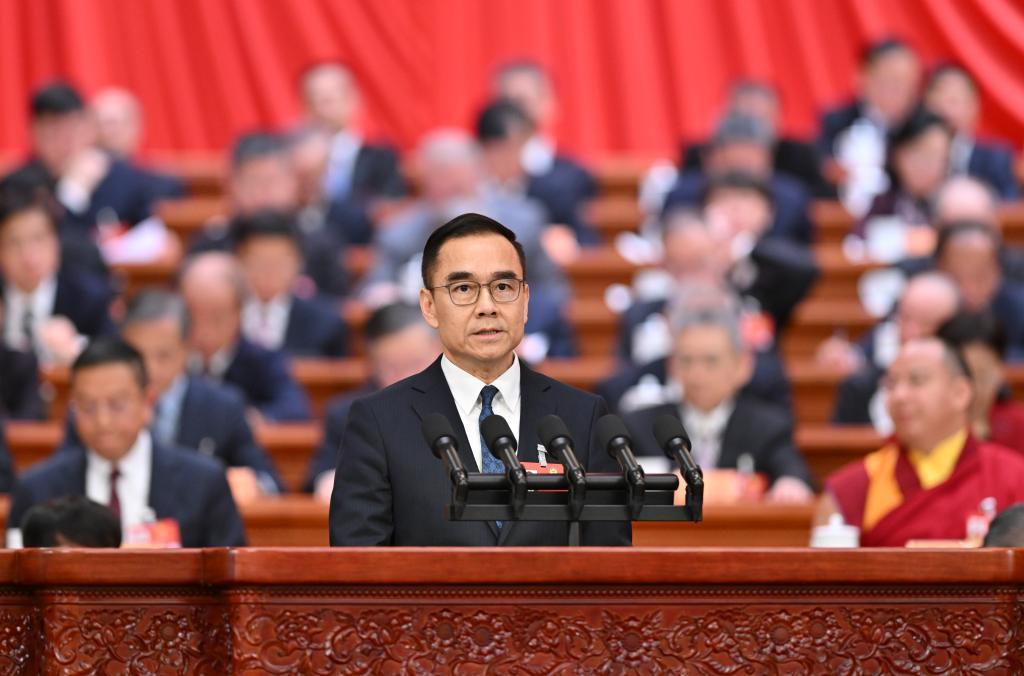 3月8日,全国政协十四届四次会议在北京人民大会堂举行第三次全体会议。这是何润生委员作题为《发挥背靠祖国联通世界优势 打造国际高端人才集聚高地》的发言。