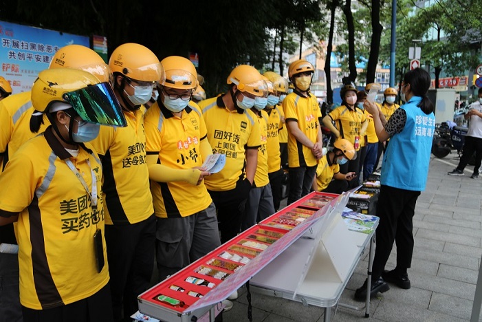 为扎实推进禁毒宣传“进万家”,6月8日,广东省深圳市盐田区盐田街道联合美团外卖公司,共同开展以“心有边界,坚守自我”为主题的禁毒宣传活动,通过外卖的形式将毒品预防知识传递到千家万户,以提高辖区居民抵御毒品的能力。