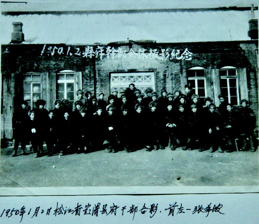 ▲ 图为1950年1月2日松江省宝清县府干部合影,前左一张希坡