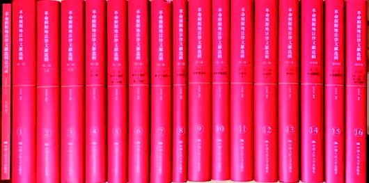 ▲ 图为中国人民大学出版社出版张希坡教授的《革命根据地法律文献选辑》,分为四辑16卷