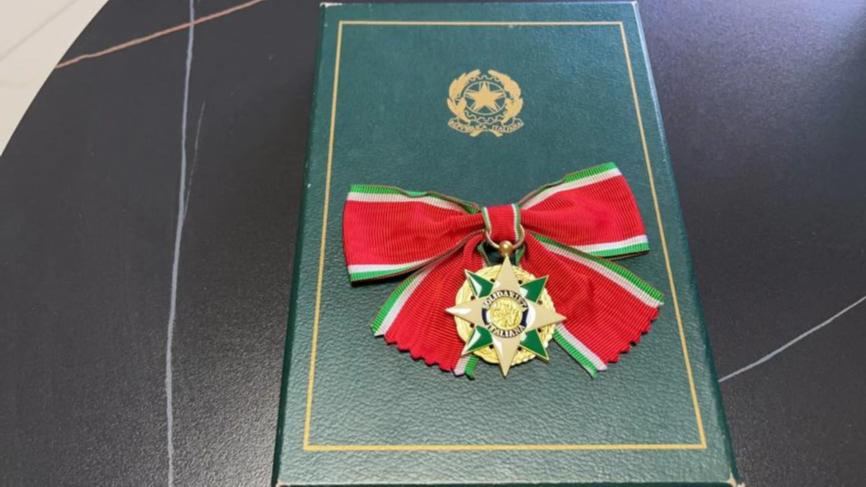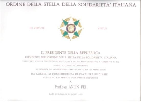 (意大利总统向费安玲颁发的“意大利共和国骑士勋章”及证书。说明:证书中的“ANLIN FEI”应为“ANLING FEI”。)
