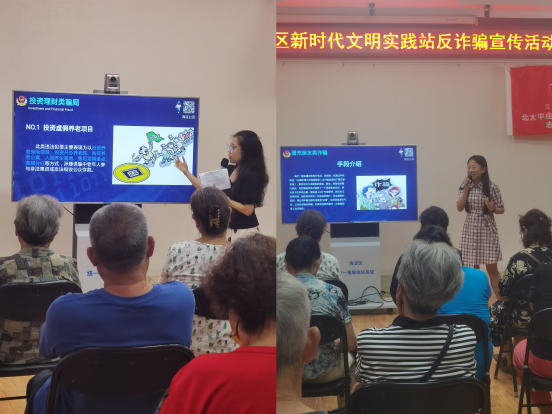 宣讲团成员王舒琦、李成秀在北京市海淀区北太平庄街道明光北里社区的社区活动中为老年人们进行了防范养老诈骗宣传。两位同学结合类型分析与实务案例,重点介绍了诱导消费类、投资理财类、养老保险类等典型骗局的诈骗方式,分享了针对性的防范路径与预防措施,并给出了具体的防范建议。两位同学的讲解帮助老年人充分认识到防范诈骗的重要性,树立了反诈意识,了解了防诈知识。