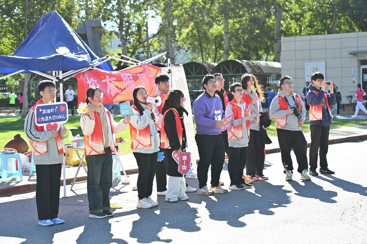 赛道两旁站满了为运动员加油的同学,挥舞着加油棒,击鼓呼喊着“运动员加油”的口号。志愿者、安保人员、医务人员也坚守岗位,用热情的服务和忙碌的身影保障比赛顺利进行。