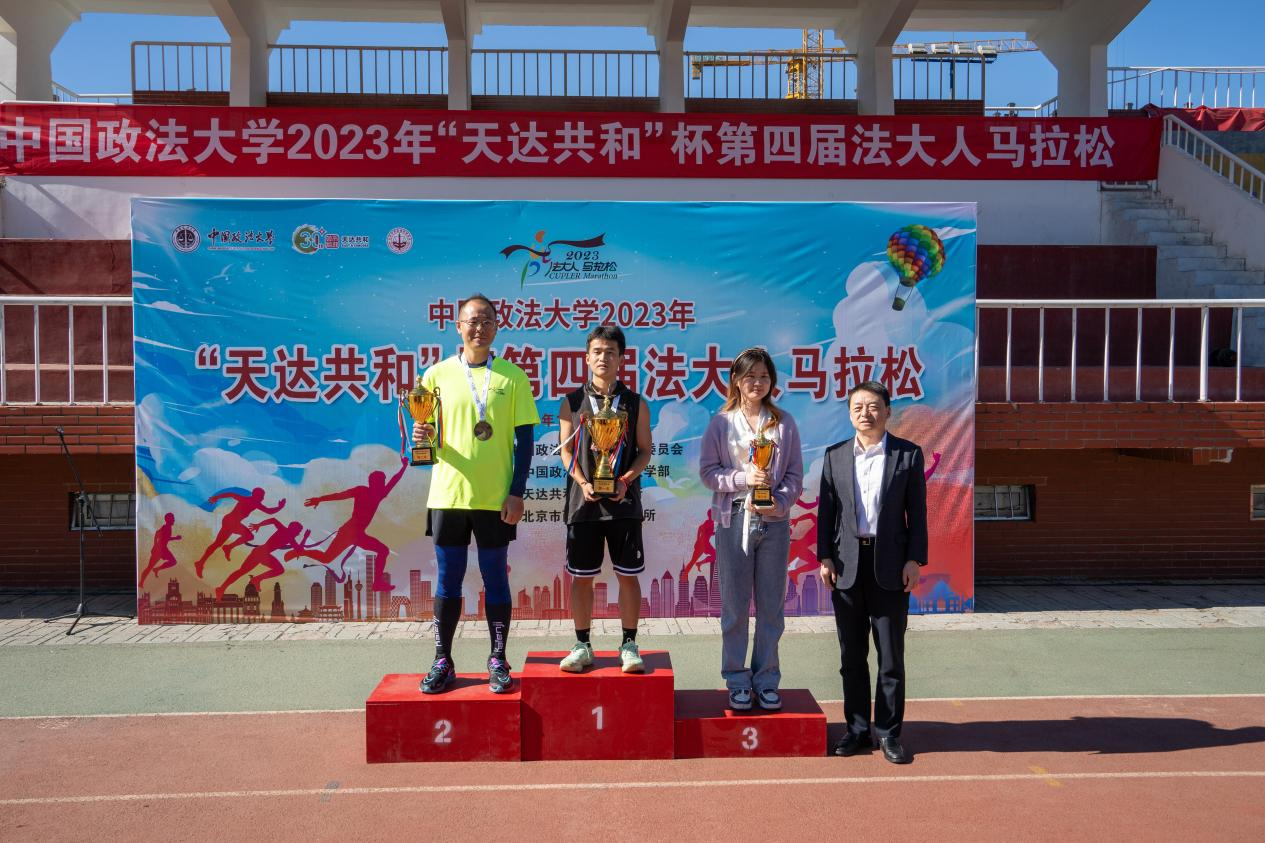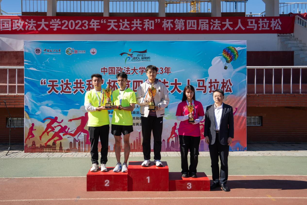 证据科学研究院研究生王东亚同学在欢呼声中第一个冲过了终点线。教工朱林、校友蒲彦萍、证据科学研究院王东亚同学、法学院杜睿思同学分别为第四届法大人马拉松教工校友男子组、教工校友女子组、学生男子组、学生女子组冠军。刑事司法学院、社会学院分获甲、乙组团体第一。