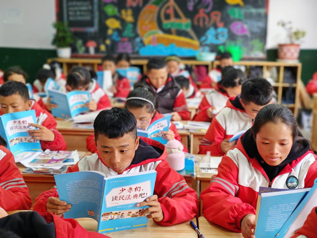 西藏自治区林芝市工布江达县中学学生在阅读《少年们,读民法典吧!》