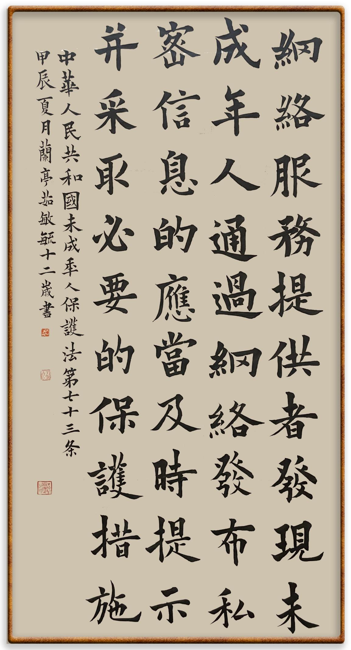 “六一”国际儿童节来临之际,法制日报社联合(全国)教育书画协会基础书法教育分会,推出“‘书·法’系列活动之书写《中华人民共和国未成年人保护法》活动”,邀请小朋友书写部分法条,让孩子们在浓浓的节日氛围中感受传统文化的独特魅力。