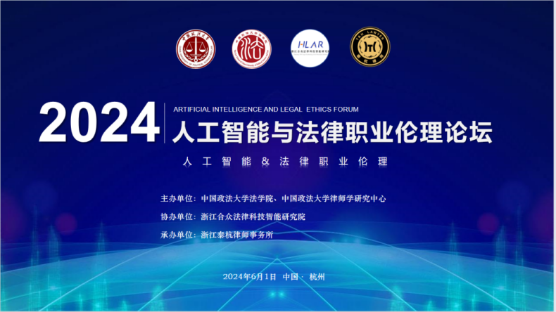 2024年6月1日,“人工智能与法律职业伦理”论坛在浙江杭州成功举办。本次论坛由中国政法大学法学院、中国政法大学律师学研究中心主办,浙江合众法律科技智能研究院协办,浙江泰杭律师事务所承办。来自中国政法大学、浙江大学、河南大学、中国计量大学、浙江警察学院、浙大城市学院、浙江警官职业学院等高等院校的专家学者,与来自上海市人民检察院、杭州互联网法院、杭州市互联网公证处、浙江省律师协会、香港和解中心、国际争议解决及风险管理协会、北京市隆安律师事务所的实务专家共计五十余人参加会议,共同研讨人工智能与法律职业伦理发展的前沿问题。