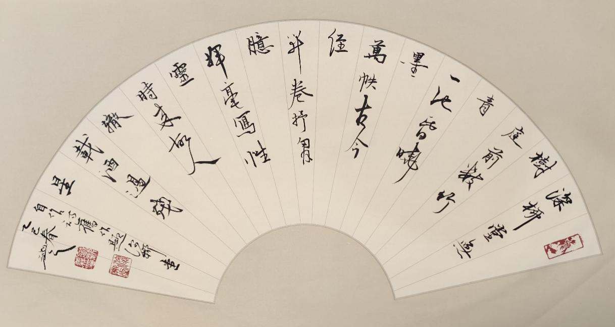 深柳堂正堂约三十平,中置三米大书案,后一列四米书柜,书籍满墙,宣纸堆山。另有木榻竹几,散贮书卷。书案正对一个书法中堂,两侧为自书陆放翁书房对联:万卷古今消永日,一窗昏晓送流年。——人生苦短,似水流年,我亦愿在这深柳堂中南窗寄傲,蕴藉滋养着仿佛贯穿千载时光的淡定与从容。
